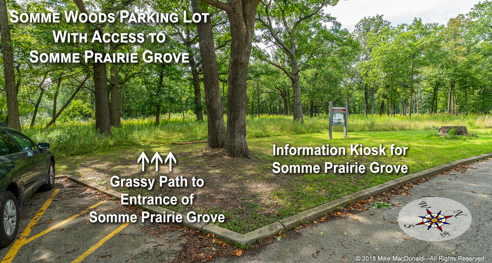 Access & Parking: The trailhead for Somme Prairie Grove is located on the northwest corner of Waukegan and Dundee Roads. The entrance is slightly obscured. The pin on our map takes you to the “official” parking lot located across the street in the Somme Woods preserve (north side of Dundee Road, just east of Waukegan). Soon after passing the gate and just past the first section of parking spots (only about 150 feet in), look to your left for the information kiosk for Somme Prairie Grove. Facing the kiosk to read it, a mowed path to the Somme Prairie Grove trails is located just yards to your left. Soon after entering the path, the trail splits. Follow the left fork and you’ll emerge from the woods onto the northeast corner of Waukegan and Dundee Roads. Cross Waukegan Road (to the NW corner) where an opening in the trees is the entrance to Somme Prairie Grove. Because some people are having trouble finding their way to Somme Prairie Grove, here’s an alternate approach. From Dundee Road, park on side streets to the west of Waukegan roads, like Laurel and Juniper Lanes. Then walk northeast to the entrance at the corner of Dundee and Waukegan.